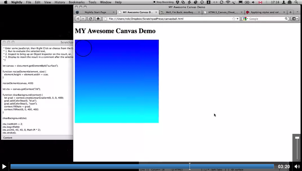 Direct link to the video (again it requires Chrome, Firefox, or Opera). Below is a screenshot showing the Scratchpad on the left that contains the code that manipulates the Canvas on the right.