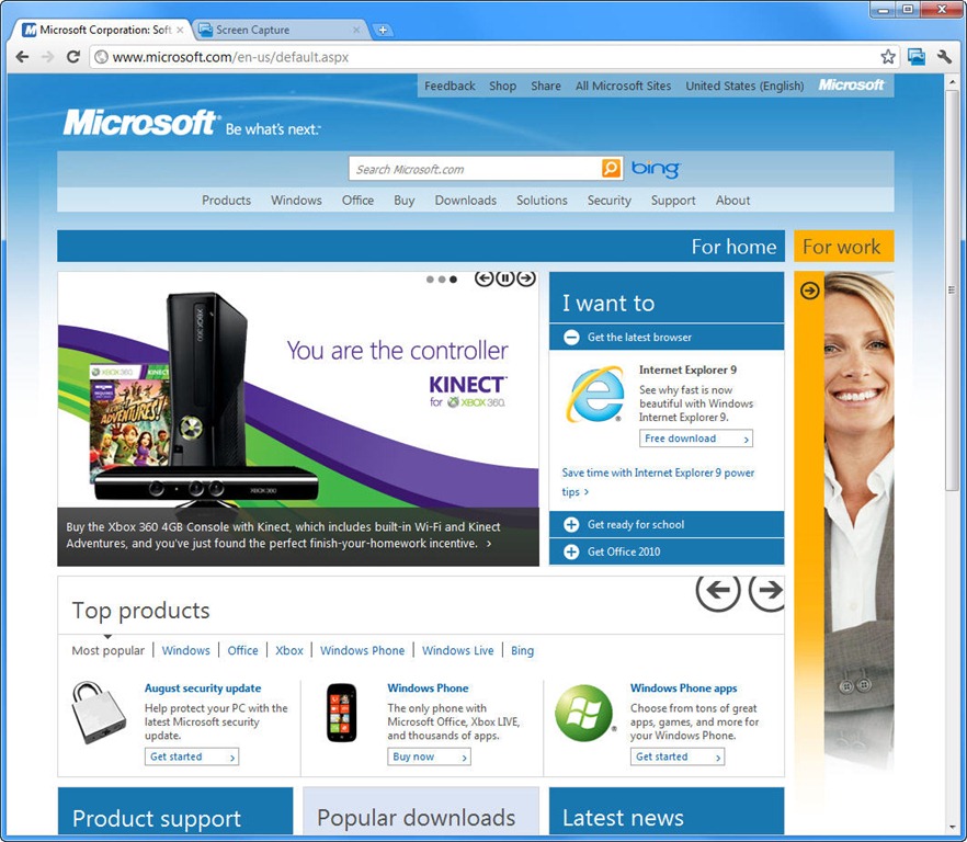 This captures the contents of the page you can see in the window without scrolling. For example, today’s Microsoft homepage looks like this in my browser window. (This was captured with Hypersnap so that you can see the browser window clearly). Notice that the scrollbar reveals that only part of the web page is shown in the window.