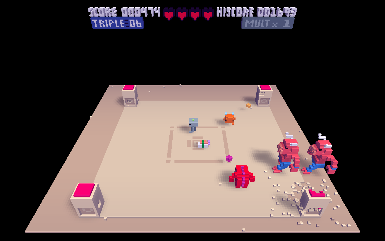 This one I bought recently. It plays at first very much like Robotron but its much more than that. One very nice feature of the gameplay is that the environment is destructible. You can see in the first screenshot below that something on the lower right has been damaged and bits of it are strewn about.